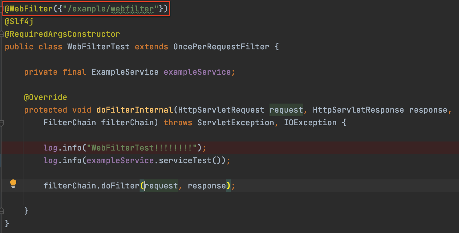 전체코드는 아래 github을 참고하도록 한다. github.com/mypiece/springboot-example/tree/master/filter-example mypiece/springboot-example 스프링부트 예제. Contribute to mypiece/springboot-example development by creating an account on GitHub. github.com SpringBoot 환경에서 ServletFilter 자체는 아래와 같이 간단하게 정의 가능하다. public class TestFilter extends OncePerRequestFilter { protected void doFilterInternal( HttpServletRequest request ,..